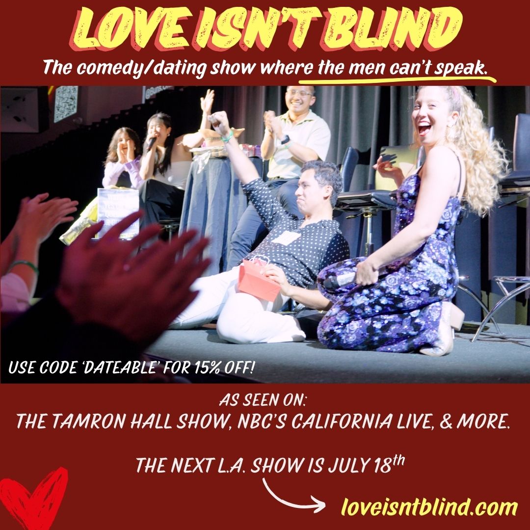 Love Isn't Blind: If you're looking for comedy, mingling, and an outright good time, check out the live dating show 'Love Isn't Blind' with comedian Allison Goldberg. The show will be coming to San Diego, Chicago, SF, LA, Denver, NYC, DC and more! Use code DATEABLE for discounted tix.